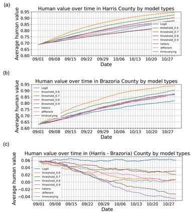 Frequent and intensive disasters make the repeated and uncertain post-disaster recovery process. Despite the importance of the successful recovery process, previous simulation studies on the post-disaster recovery process did not explore the sufficient number of household return decision model types, population sizes, and the corresponding critical transition conditions of the system. This paper simulates the recovery process in the agent-based model with multilayer networks to reveal the impact of household return decision model types and population sizes in a toy network. After that, this paper applies the agent-based model to the five selected counties affected by Hurricane Harvey in 2017 to check the urban-rural recovery differences by types of household return decision models. The agent-based model yields three conclusions. First, the threshold model can successfully substitute the binary logit model. Second, high thresholds and less than 1,000 populations perturb the recovery process, yielding critical transitions during the recovery process. Third, this study checks the urban-rural recovery value differences by different decision model types. This study highlights the importance of the threshold models and population sizes to check the critical transitions and urban-rural differences in the recovery process.