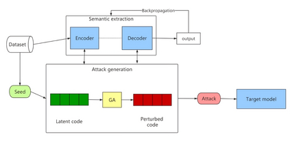 Widely used deep learning models are found to have poor robustness. Little noises can fool state-of-the-art models into making incorrect predictions. While there is a great deal of high-performance attack generation methods, most of them directly add perturbations to original data and measure them using L_p norms; this can break the major structure of data, thus, creating invalid attacks. In this paper, we propose a black-box attack, which, instead of modifying original data, modifies latent features of data extracted by an autoencoder; then, we measure noises in semantic space to protect the semantics of data. We trained autoencoders on MNIST and CIFAR-10 datasets and found optimal adversarial perturbations using a genetic algorithm. Our approach achieved a 100% attack success rate on the first 100 data of MNIST and CIFAR-10 datasets with less perturbation than FGSM.