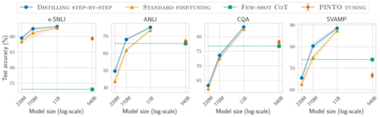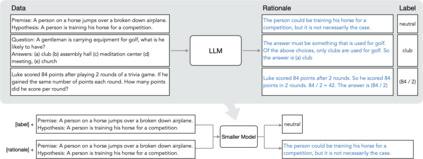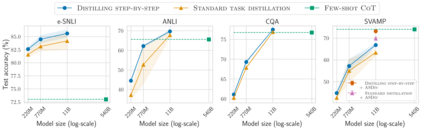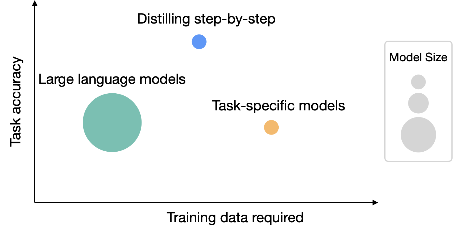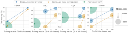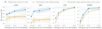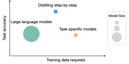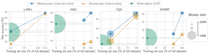 Deploying large language models (LLMs) is challenging because they are memory inefficient and compute-intensive for practical applications. In reaction, researchers train smaller task-specific models by either finetuning with human labels or distilling using LLM-generated labels. However, finetuning and distillation require large amounts of training data to achieve comparable performance to LLMs. We introduce Distilling step-by-step, a new mechanism that (a) trains smaller models that outperform LLMs, and (b) achieves so by leveraging less training data needed by finetuning or distillation. Our method extracts LLM rationales as additional supervision for training small models within a multi-task framework. We present three findings across 4 NLP benchmarks: First, compared to both finetuning and distillation, our mechanism achieves better performance with much fewer labeled/unlabeled training examples. Second, compared to few-shot prompted LLMs, we achieve better performance using substantially smaller model sizes. Third, we reduce both the model size and the amount of data required to outperform LLMs; our finetuned 770M T5 model outperforms the few-shot prompted 540B PaLM model using only 80% of available data on a benchmark, whereas standard finetuning the same T5 model struggles to match even by using 100% of the dataset. We release the code at: https://github.com/google-research/distilling-step-by-step .