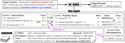 Recent supervised models for event coding vastly outperform pattern-matching methods. However, their reliance solely on new annotations disregards the vast knowledge within expert databases, hindering their applicability to fine-grained classification. To address these limitations, we explore zero-shot approaches for political event ontology relation classification, by leveraging knowledge from established annotation codebooks. Our study encompasses both ChatGPT and a novel natural language inference (NLI) based approach named ZSP. ZSP adopts a tree-query framework that deconstructs the task into context, modality, and class disambiguation levels. This framework improves interpretability, efficiency, and adaptability to schema changes. By conducting extensive experiments on our newly curated datasets, we pinpoint the instability issues within ChatGPT and highlight the superior performance of ZSP. ZSP achieves an impressive 40% improvement in F1 score for fine-grained Rootcode classification. ZSP demonstrates competitive performance compared to supervised BERT models, positioning it as a valuable tool for event record validation and ontology development. Our work underscores the potential of leveraging transfer learning and existing expertise to enhance the efficiency and scalability of research in the field.