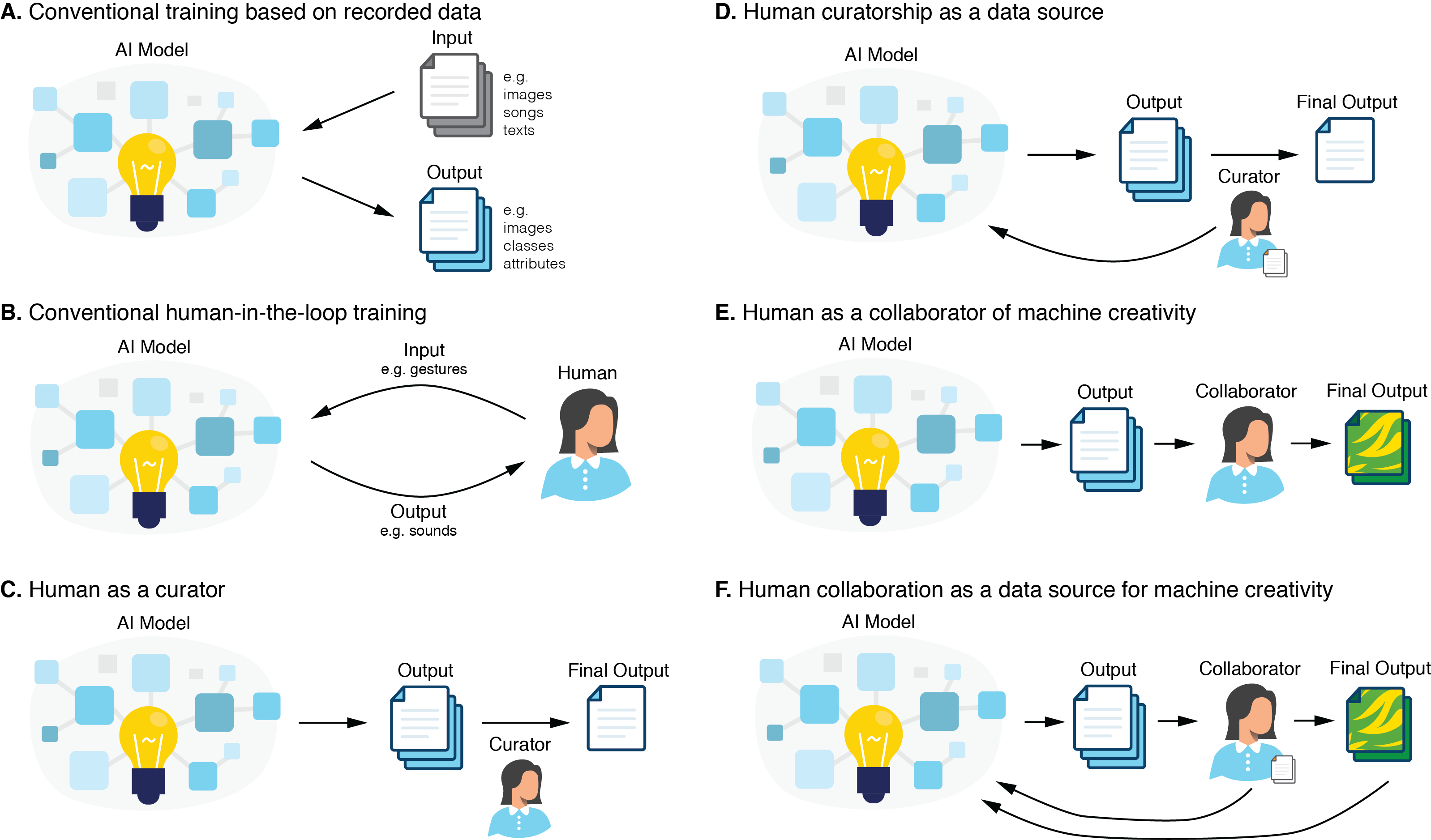 翻译:人工智能(AI)越来越多地用于合成视觉、文本和音频。这些基于人工智能的作品通常来自神经网络,正在进入主流市场,作为数字绘画、歌曲、书籍和其他。我们构思了现有和未来的“流动中人”(HITL)的创造性应用方法,并开发了更直观、细微和多式的模型。特别是,我们作为管理员和协作者的专门知识如何以互动的方式在AI模型中编码?我们研究和猜测对模型、界面和机器创造力的长期影响。我们对人工智能艺术的选择、创造和解释必然包含我们的情感反应、文化和背景。因此,拟议的“HITL”可以帮助算法学习难以编纂或量化的创造性过程。我们设想了“多式”的“流动人”过程,其中的文字、视觉、声音和其他信息与人类和环境的自动分析相结合。总体而言,这些“智能”方法将增加人与AI之间的相互作用,从而帮助未来的AI系统更好地了解我们自己的创造性和情感过程。