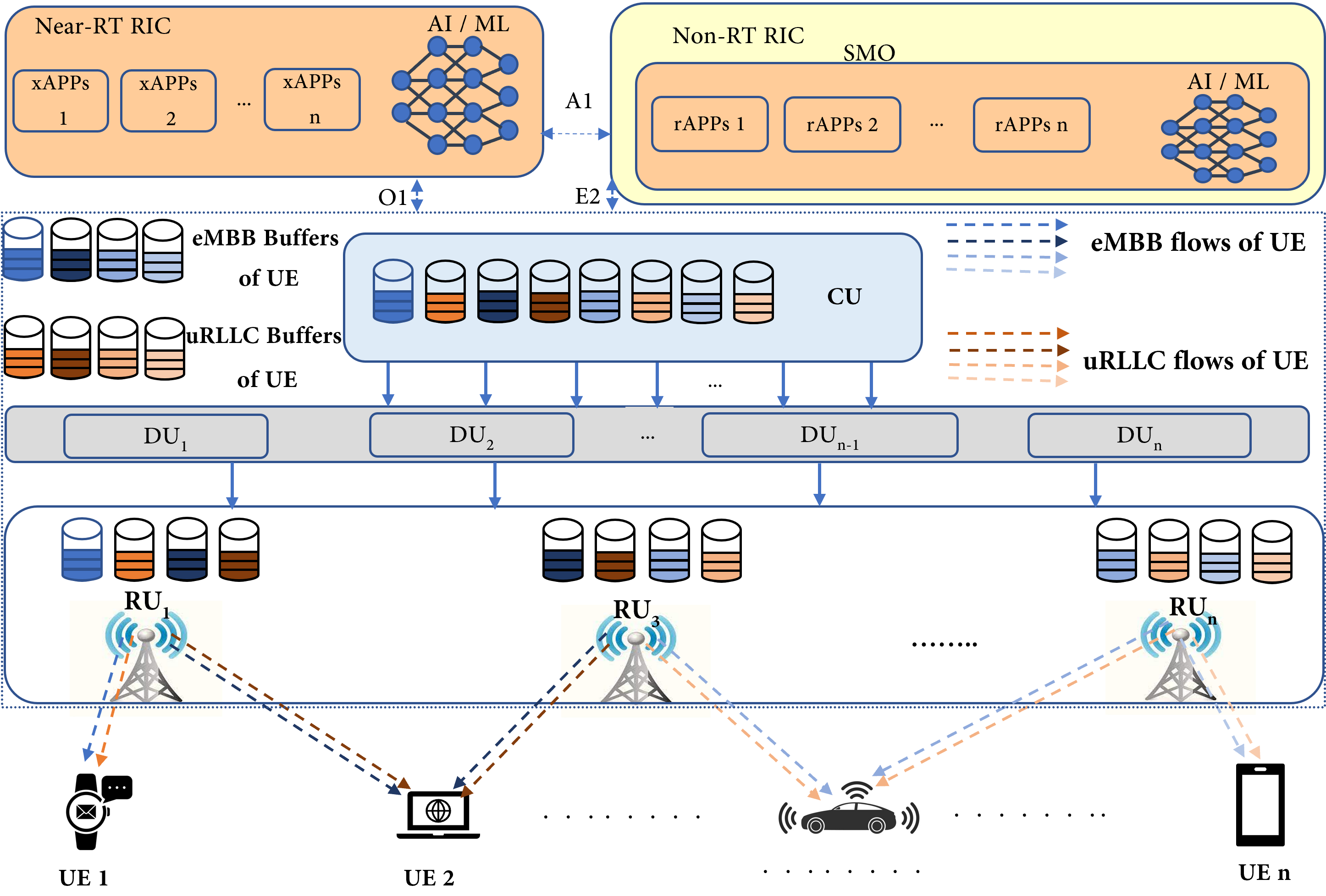 In this paper, an artificial intelligence (AI)-driven efficient RAN management framework is proposed. This framework introduces the concept of a introducing the multi-service-modal UE (MSMU) system, which allows a single UE to handle both eMBB and uRLLC services. The proposed framework integrates traffic demand prediction, route optimization, RAN slicing, service identification, and radio resource management under uncertainty. The challenge of dynamic environments in such a system is addressed by decomposing the optimization problem into long-term (L-SP) and short-term (S-SP) subproblems. Using a long short-term memory (LSTM) model, the proposed approach allows the prediction of eMBB and uRLLC traffic demands and optimal routes for RAN slicing in the L-SP. For the S-SP, another LSTM model is employed to handle real-time service type identification and resource management based on long-term predictions. To support continuous adaptation, continual learning is incorporated into the S-SP framework, allowing the model to learn new service types while retaining prior knowledge. Experimental results show that the proposed framework efficiently manages dual-mode UEs, achieving low mean square error for traffic demand (0.003), resource block prediction (0.003), and power prediction (0.002), with 99\% accuracy in service type and route selection and over 95\% average accuracy for continual service adaptation across seven tasks.