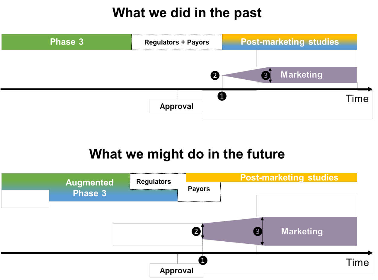 The past few years have seen an increasing number of initiatives aimed at integrating information generated outside of confirmatory randomised clinical trials (RCTs) into drug development. However, data generated non-concurrently and through observational studies can provide results that are difficult to compare with randomised trial data. Moreover, the scientific questions these data can serve to answer often remain vague. Our starting point is to use clearly defined objectives for evidence generation, which are formulated towards early discussion with health technology assessment (HTA) bodies and are additional to regulatory requirements for authorisation of a new treatment. We propose FACTIVE (Flexible Augmented Clinical Trial for Improved eVidencE generation), a new class of study designs enabling flexible augmentation of confirmatory randomised controlled trials with concurrent and close-to-real-world elements. These enabling designs facilitate estimation of certain treatment effects in the confirmatory part and other, complementary treatment effects in a concurrent real-world part. Each stakeholder should use the evidence that is relevant within their own decision-making framework. High quality data are generated under one single protocol and the use of randomisation ensures rigorous statistical inference and interpretation within and between the different parts of the experiment. Evidence for the decision-making of HTA bodies could be available earlier than is currently the case.