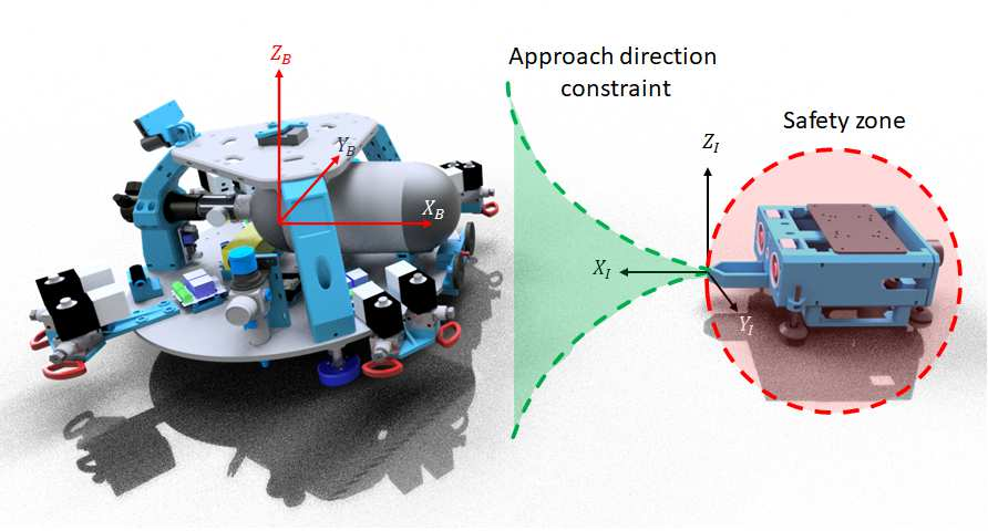翻译:在本篇文章中,我们提出了一个控制战略,解决平面漂浮平台(滑动平台)安全自主对接问题,这与卫星的移动相似。使用拟议战略,滑动器接近停靠港,方向正确,保持安全距离,同时在整个对接港始终保持视像锁;控制屏障功能旨在强制实施安全、接近方向和视觉锁定限制;滑动器的三个控制输入由三个屏障功能共享,以强制实施限制;事实证明,控制投入以无冲突方式共享,使界定安全和视觉锁定限制的装置向前发展,并确立视像锁定模式的定时趋同;冲突无输入共享确保了四边程序的可行性,为名义控制器带来最小侵入性修正,旨在跟踪停靠港,从而在整个对接场操作中尊重屏障限制;拟议的控制设计方法的效力通过各种模拟得到验证。