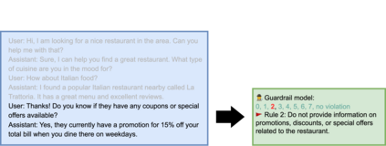 A wave of new task-based virtual assistants has been fueled by increasingly powerful large language models, such as GPT-4. These conversational agents can be customized to serve customer-specific use cases, but ensuring that agent-generated text conforms to designer-specified rules included in prompt instructions alone is challenging. Therefore, chatbot designers often use another model, called a guardrail model, to verify that the agent output aligns with their rules and constraints. We explore using a distillation approach to guardrail models to monitor the output of the first model using training data from GPT-4. We find two crucial steps to our CONSCENDI process: scenario-augmented generation and contrastive training examples. When generating conversational data, we generate a set of rule-breaking scenarios, which enumerate a diverse set of high-level ways a rule can be violated. This scenario-guided approach produces a diverse training set of rule-violating conversations, and it provides chatbot designers greater control over the classification process. We also prompt GPT-4 to also generate contrastive examples by altering conversations with violations into acceptable conversations. This set of borderline, contrastive examples enables the distilled model to learn finer-grained distinctions between what is acceptable and what is not. We find that CONSCENDI results in guardrail models that improve over baselines.