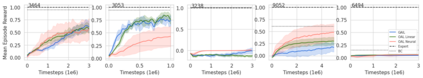 翻译:在学徒学习(AL)中,我们得到了一个没有成本功能的Markov决定程序(MDP),我们没有获得成本功能。相反,我们观察的是由一位按照某些政策行事的专家抽样的轨迹。我们的目标是找到一种与专家在某些预定义的成本功能上的表现相匹配的政策。我们引入了AL(在线学徒学习;OAL)的在线变体(在线学徒学习;OAL),预计代理商在与环境互动时能够与专家的轨迹数量相对应。我们表明,OAL问题可以通过两种基于无回报的镜谱下行算法相结合来有效解决。一种基于政策优化的反向下行法,另一种用于学习最坏的个案成本。我们通过乐观的探索,我们得出一种与美元(sqrt{K}) 相匹配的算法,其中$(sqoqrt{K}) 是与MDP互动的次数,另外一种线性错误术语,取决于专家的轨迹数量。重要的是,我们的算法避免了在每次轨迹上解决MDP的需要,使其与以前的方法比较更为实用。最后,我们用一个与AL方法来得出最差的算法。最后,我们用高的GAAL}的变式算法,我们学习了一种高的变式,我们用GAALLALALLA。