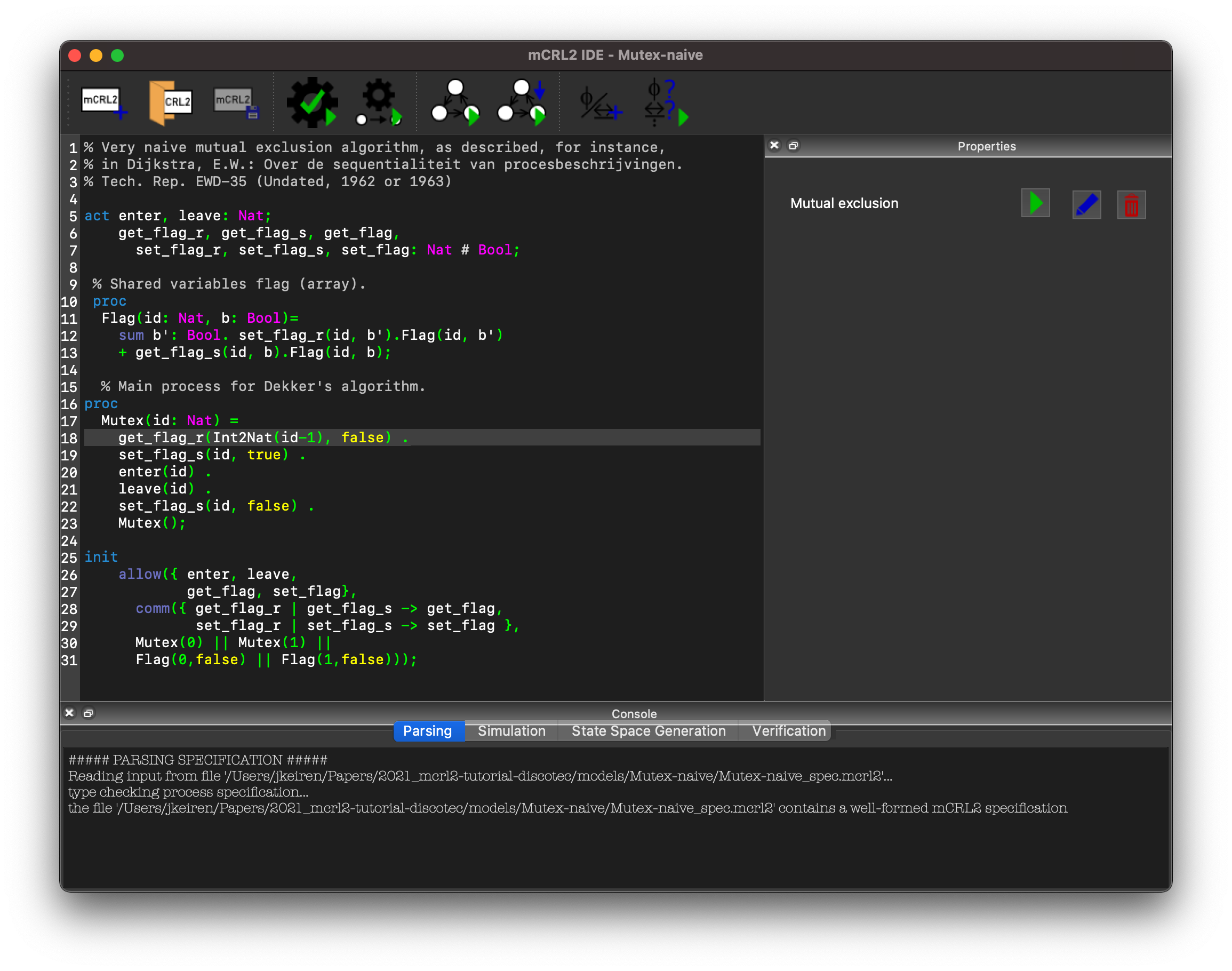 Distributed software is very tricky to implement correctly as some errors only occur in peculiar situations. For such errors testing is not effective. Mathematically proving correctness is hard and time consuming, and therefore, it is rarely done. Fortunately, there is a technique in between, namely model checking, that, if applied with skill, is both efficient and able to find rare errors. In this tutorial we show how to create behavioural models of parallel software, how to specify requirements using modal formulas, and how to verify these. For that we use the mCRL2 language and toolset (https://www.mcrl2.org/). We discuss the design of an evolution of well-known mutual exclusion protocols, and how model checking not only provides insight in their behaviour and correctness, but also guides their design.