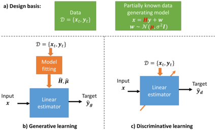 Inference tasks in signal processing are often characterized by the availability of reliable statistical modeling with some missing instance-specific parameters. One conventional approach uses data to estimate these missing parameters and then infers based on the estimated model. Alternatively, data can also be leveraged to directly learn the inference mapping end-to-end. These approaches for combining partially-known statistical models and data in inference are related to the notions of generative and discriminative models used in the machine learning literature, typically considered in the context of classifiers. The goal of this lecture note is to introduce the concepts of generative and discriminative learning for inference with a partially-known statistical model. While machine learning systems often lack the interpretability of traditional signal processing methods, we focus on a simple setting where one can interpret and compare the approaches in a tractable manner that is accessible and relevant to signal processing readers. In particular, we exemplify the approaches for the task of Bayesian signal estimation in a jointly Gaussian setting with the mean-squared error (MSE) objective, i.e., a linear estimation setting.