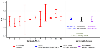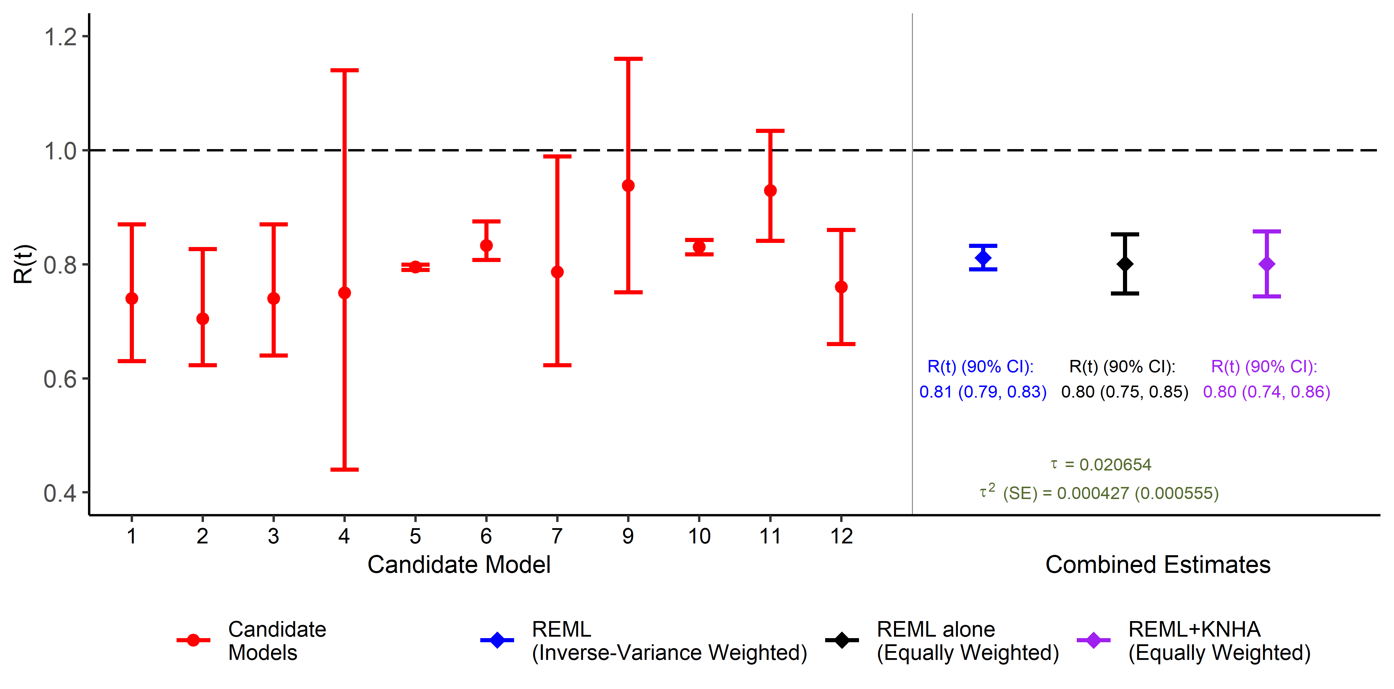 翻译:在最近的COVID-19大流行中,使用了一系列广泛的流行病学建模方法来预测有效的复制号、R(t)和其他COVID-19相关措施,如指数增长率的每日指数增长率,r(t)。这些候选模型使用不同的建模方法或对空间或年龄混合的不同假设,有些则捕捉了对疾病动态的科学理解的真正不确定性。从多个候选模型中采用适当的统计方法将估计数结合起来,对于更好地了解这些结果措施的差异,以帮助决策。在本文件中,我们采用随机效应元分析技术,利用有限的最大可能性(REML)方法来估计异性差异参数,以及两种方法来计算综合估计数的信心间隔:标准Wald类型间隔;以及Knapp和Hartung(KNHA)方法。由于这一环境中的估计数是使用模型预测得出的,每个模型的不确定性程度各不相同,因此赞成这些估算与所有更标准的逆差加权法相比,以避免可能使提供低不确定性的模型的增量(REML)方法用于估计异性差异参数,而这种不确定性的低度是无法对内在不确定性进行充分计算的关键数据分析。