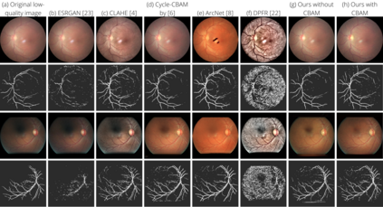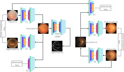 翻译:以低质量的基金形图像进行临床筛选具有挑战性,并在很大程度上导致误判。本文件述及通过视网膜图像恢复来改善视网膜图像质量和容器分离率的问题。 更具体地说, 使用循环兼容的基因对抗网络( CycleGAN ), 配有相容区块关注模块( CBAM ) 来恢复视网膜图像。 修改后的UNet 用于恢复视网膜图像( CBAM-UNet ) 的视网膜分离。 提议的模型由两个生成器和两个分析器组成。 发电机将图像从一个域转换成另一个域, 即从低质量到高质量和反向转化。 差异分析器将生成的和原始图像进行分类分类。 矩形结构分割模型使用下标、 平整的图像重新校正、 模型的重新校正评估, 将现有的低和高质量的图像重新校正。 提议的方法可以大量恢复。