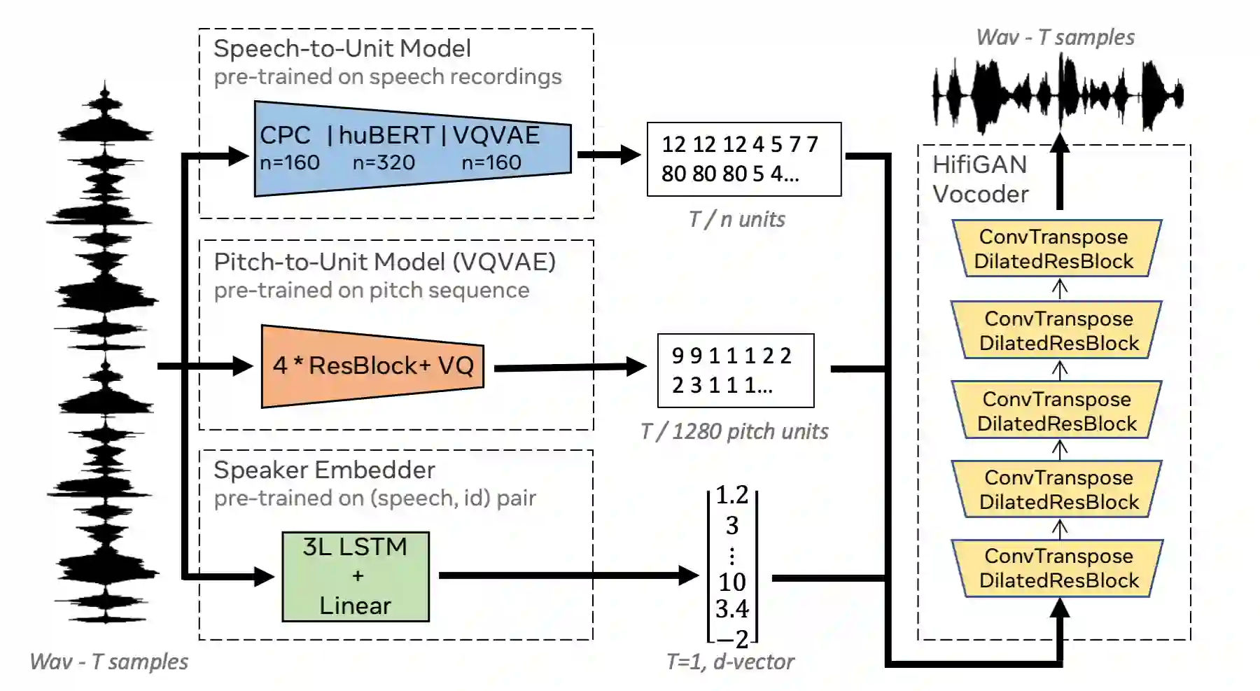 翻译:我们建议使用自我监督的离散表达方式来完成语音合成任务。 为了产生分解的表达方式, 我们分别提取低位表达方式, 用于表达内容、 预想信息和发言者身份。 这样可以以可控制的方式合成语音。 我们分析各种最先进的自我监督的表达方式, 并在考虑重建质量和分解特性的同时, 阐明每种方法的优点。 具体地说, 我们用主观的人类评价来评估F0重建、 语音识别性能( 重复和声音转换)、 录音的智能性以及总体质量。 最后, 我们展示这些表达方式如何用于超轻量语言代码。 使用所获得的表达方式, 我们可以达到每秒365位, 同时提供比基线方法更好的语言质量。 音频样本可以在 https://resynthes-sl.github.io/ 下找到 。