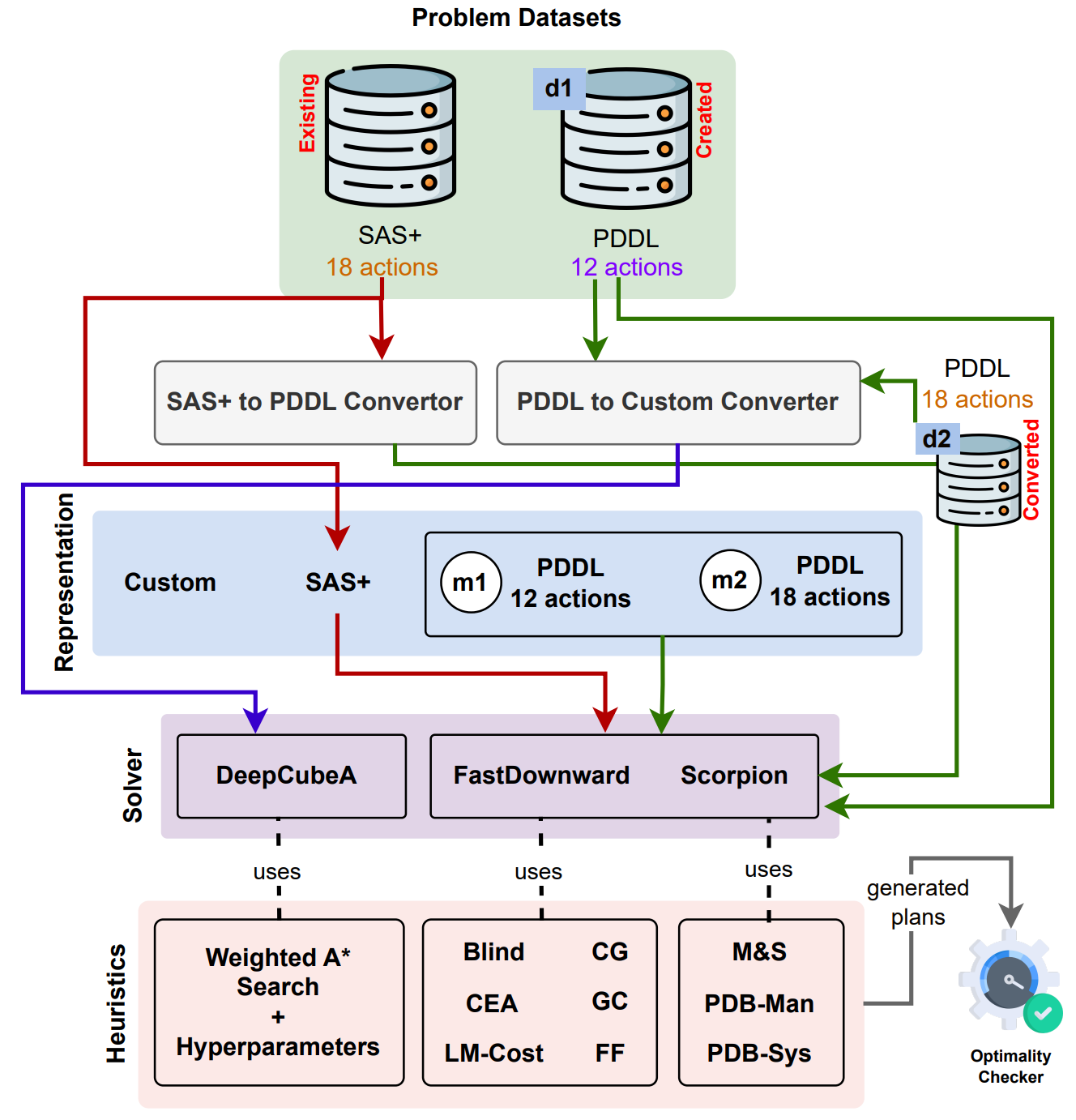 Rubik's Cube (RC) is a well-known and computationally challenging puzzle that has motivated AI researchers to explore efficient alternative representations and problem-solving methods. The ideal situation for planning here is that a problem be solved optimally and efficiently represented in a standard notation using a general-purpose solver and heuristics. The fastest solver today for RC is DeepCubeA with a custom representation, and another approach is with Scorpion planner with State-Action-Space+ (SAS+) representation. In this paper, we present the first RC representation in the popular PDDL language so that the domain becomes more accessible to PDDL planners, competitions, and knowledge engineering tools, and is more human-readable. We then bridge across existing approaches and compare performance. We find that in one comparable experiment, DeepCubeA solves all problems with varying complexities, albeit only 18\% are optimal plans. For the same problem set, Scorpion with SAS+ representation and pattern database heuristics solves 61.50\% problems, while FastDownward with PDDL representation and FF heuristic solves 56.50\% problems, out of which all the plans generated were optimal. Our study provides valuable insights into the trade-offs between representational choice and plan optimality that can help researchers design future strategies for challenging domains combining general-purpose solving methods (planning, reinforcement learning), heuristics, and representations (standard or custom).