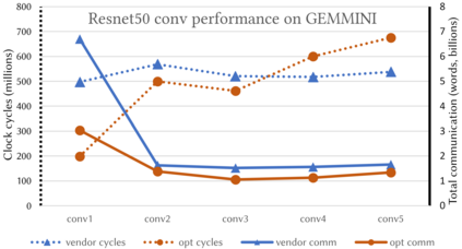 翻译:革命性神经网络(CNNs)在各种机器学习任务和应用中都很重要,因此,优化其性能是必不可少的。在记忆层层次之间或网络处理器之间移动数据词汇比算术成本昂贵得多,因此最大限度地减少通信对于优化性能至关重要。在本文中,我们提出了在单一处理器和平行分布式存储模型中混合精度变化数据流动的新下限,以及比当前实施方式(如IM2Col)超速的算法。我们用机器学习加速器GEMMINI(机器学习加速器)获得性能数字,我们的平铺比供应商提供的算法改进了13%至150%。