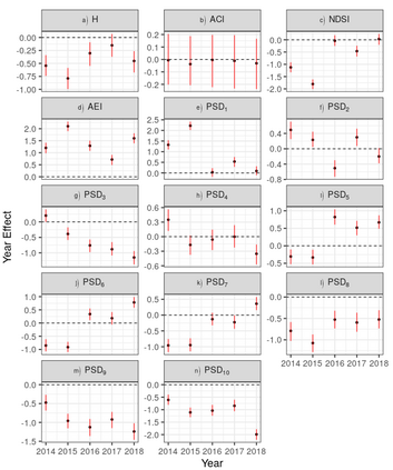 翻译:评估人为扰动对野生生物的影响是一项必要的保护任务。 声景是声学交流有机体的关键生境组成部分, 但使用声景作为评估扰动影响的工具一直相对没有探索到最近。 我们在这里展示了一个广泛的模型框架, 用于评估对声景的扰动影响。 我们使用这个框架来量化棚林伐木对密歇根北部声景的影响。 我们的模型方法可以广泛用于评估人为扰动对声景的影响。 这种方法包含控制和处理场地的内在差异, 以改善对治疗效应的推断, 同时还要计算影响声学指数的超常变量( 如雨) 。 记录是在护林伐木之前和之后的13个地点取得的。 4个地点是伐木区以外的9个地点作为控制记录记录。 我们用共同的声景指数( 杂变变异声景指数( NDSI), Acoucicentic Enclority Inview 指数( ACI ), 也计算出影响声调平衡指数 (AENI ), Wech Pow Sprectal Speal Excial rescienceal resmal resmal resulational resmal resmal resmal resmal resulational resmal resmal resmal resmal resmal resmal ress resmal resmal resmal, resmal resmal,, resmal resmisal, resmisal resmal resmal resmal 。 我们。 我们根,,, 。 我们, 。 我们的声调 分析中, 。