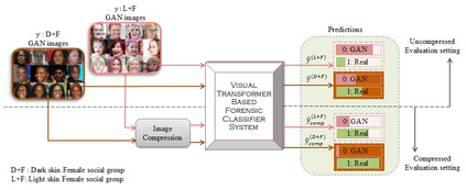 It is not only sufficient to construct computational models that can accurately classify or detect fake images from real images taken from a camera, but it is also important to ensure whether these computational models are fair enough or produce biased outcomes that can eventually harm certain social groups or cause serious security threats. Exploring fairness in forensic algorithms is an initial step towards correcting these biases. Since visual transformers are recently being widely used in most image classification based tasks due to their capability to produce high accuracies, this study tries to explore bias in the transformer based image forensic algorithms that classify natural and GAN generated images. By procuring a bias evaluation corpora, this study analyzes bias in gender, racial, affective, and intersectional domains using a wide set of individual and pairwise bias evaluation measures. As the generalizability of the algorithms against image compression is an important factor to be considered in forensic tasks, this study also analyzes the role of image compression on model bias. Hence to study the impact of image compression on model bias, a two phase evaluation setting is followed, where a set of experiments is carried out in the uncompressed evaluation setting and the other in the compressed evaluation setting.