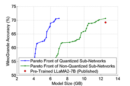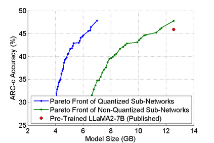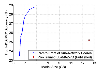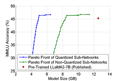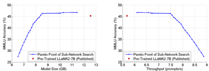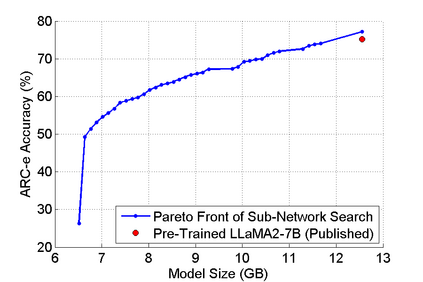 The abilities of modern large language models (LLMs) in solving natural language processing, complex reasoning, sentiment analysis and other tasks have been extraordinary which has prompted their extensive adoption. Unfortunately, these abilities come with very high memory and computational costs which precludes the use of LLMs on most hardware platforms. To mitigate this, we propose an effective method of finding Pareto-optimal network architectures based on LLaMA2-7B using one-shot NAS. In particular, we fine-tune LLaMA2-7B only once and then apply genetic algorithm-based search to find smaller, less computationally complex network architectures. We show that, for certain standard benchmark tasks, the pre-trained LLaMA2-7B network is unnecessarily large and complex. More specifically, we demonstrate a 1.5x reduction in model size and 1.3x speedup in throughput for certain tasks with negligible drop in accuracy. In addition to finding smaller, higher-performing network architectures, our method does so more effectively and efficiently than certain pruning or sparsification techniques. Finally, we demonstrate how quantization is complementary to our method and that the size and complexity of the networks we find can be further decreased using quantization. We believe that our work provides a way to automatically create LLMs which can be used on less expensive and more readily available hardware platforms.