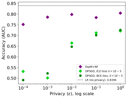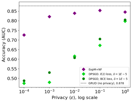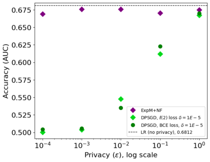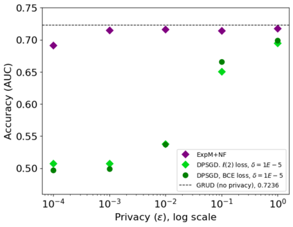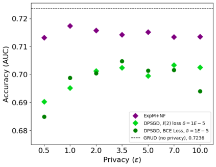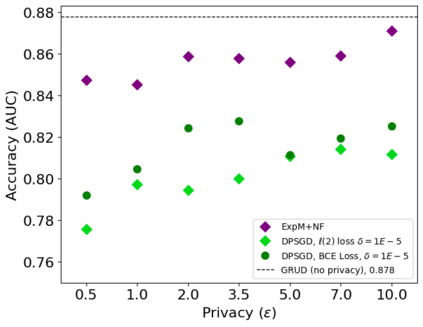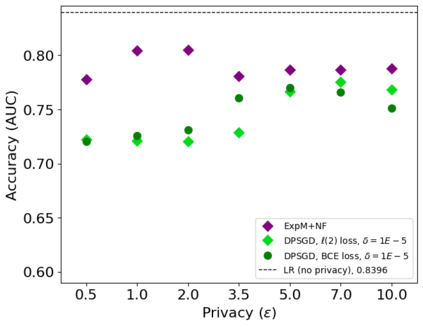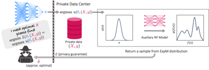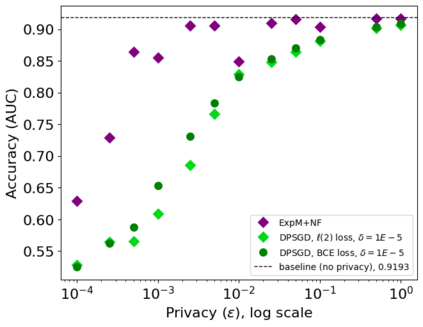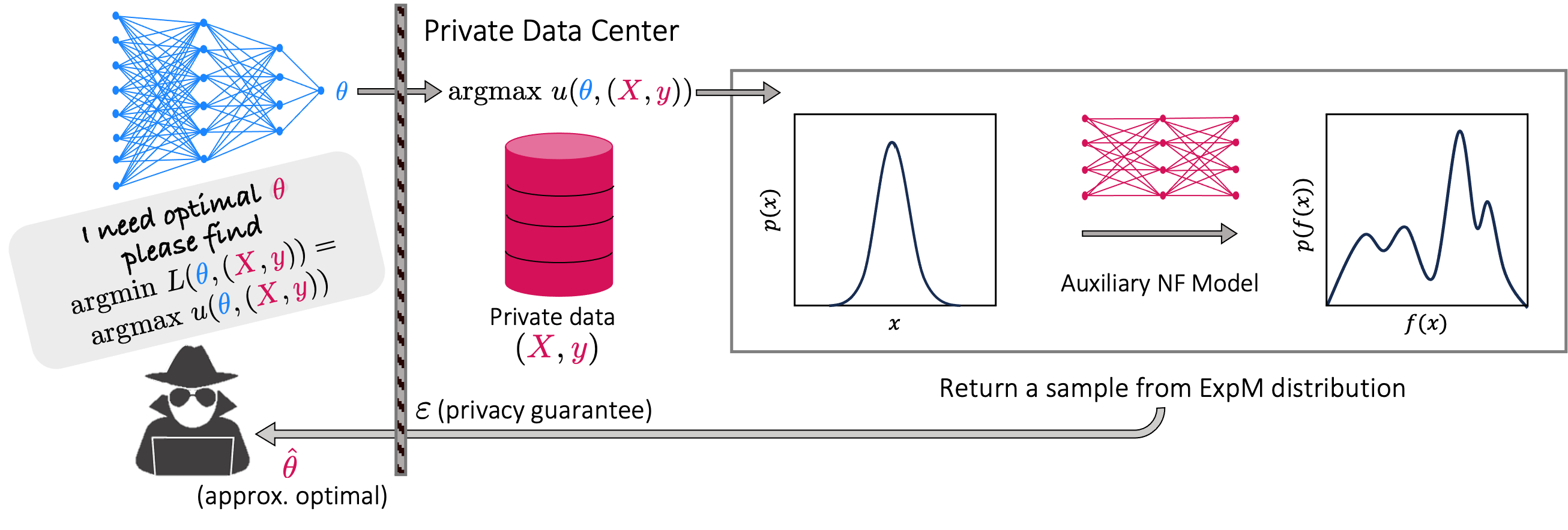 In this pioneering work we formulate ExpM+NF, a method for training machine learning (ML) on private data with pre-specified differentially privacy guarantee $\varepsilon>0, \delta=0$, by using the Exponential Mechanism (ExpM) and an auxiliary Normalizing Flow (NF). We articulate theoretical benefits of ExpM+NF over Differentially Private Stochastic Gradient Descent (DPSGD), the state-of-the-art (SOTA) and de facto method for differentially private ML, and we empirically test ExpM+NF against DPSGD using the SOTA implementation (Opacus with PRV accounting) in multiple classification tasks on the Adult Dataset (census data) and MIMIC-III Dataset (electronic healthcare records) using Logistic Regression and GRU-D, a deep learning recurrent neural network with ~20K-100K parameters. In all experiments, ExpM+NF achieves greater than 93% of the non-private training accuracy (AUC) for $\varepsilon \in [1\mathrm{e}{-3}, 1]$, exhibiting greater accuracy (higher AUC) and privacy (lower $\varepsilon$ with $\delta=0$) than DPSGD. Differentially private ML generally considers $\varepsilon \in [1,10]$ to maintain reasonable accuracy; hence, ExpM+NF's ability to provide strong accuracy for orders of magnitude better privacy (smaller $\varepsilon$) substantially pushes what is currently possible in differentially private ML. Training time results are presented showing ExpM+NF is comparable to (slightly faster) than DPSGD. Code for these experiments will be provided after review. Limitations and future directions are provided.