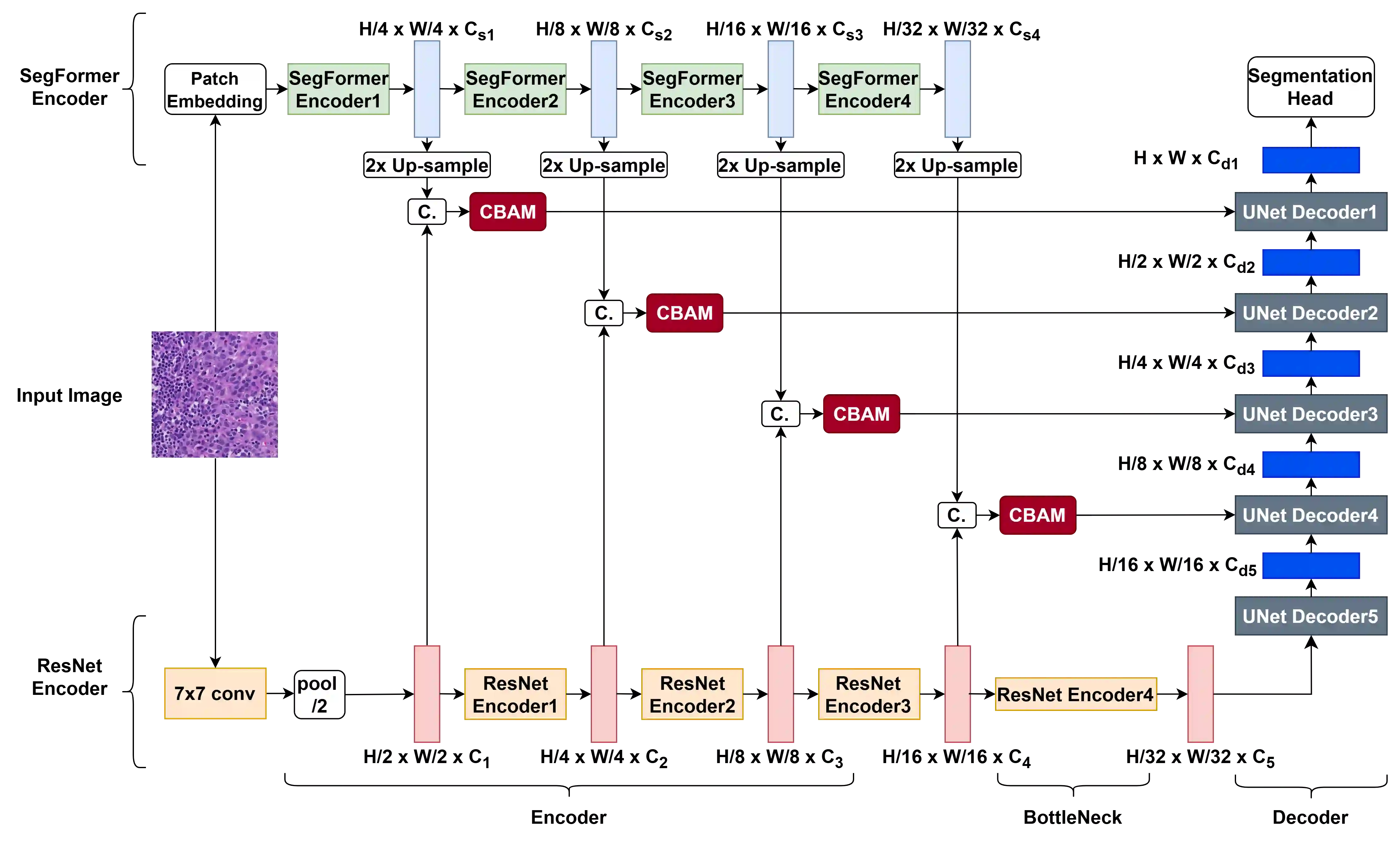 Automated histopathological image analysis plays a vital role in computer-aided diagnosis of various diseases. Among developed algorithms, deep learning-based approaches have demonstrated excellent performance in multiple tasks, including semantic tissue segmentation in histological images. In this study, we propose a novel approach based on attention-driven feature fusion of convolutional neural networks (CNNs) and vision transformers (ViTs) within a unified dual-encoder model to improve semantic segmentation performance. Evaluation on two publicly available datasets showed that our model achieved {\mu}IoU/{\mu}Dice scores of 76.79%/86.87% on the GCPS dataset and 64.93%/76.60% on the PUMA dataset, outperforming state-of-the-art and baseline benchmarks. The implementation of our method is publicly available in a GitHub repository: https://github.com/NimaTorbati/ACS-SegNet