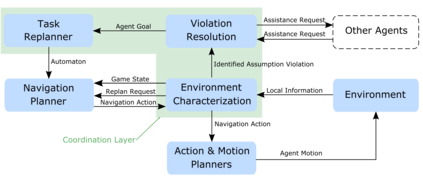 翻译:在本文中,我们引入了一个高级控制器综合框架,使不同物剂小组能够互相协助解决在运行时出现的环境冲突。这种解决冲突的方法建立在基于时间的基于逻辑的被动合成基础上,以保证在特定环境假设下安全和完成任务。在多种物剂系统中,每个物剂都有望完成自己的任务,为全球团队的目标服务。然而,在运行时,一个物剂可能遇到非模型化障碍(如门或墙),使其无法完成自己的任务。为解决这一问题,我们利用其他不同物剂的能力来消除障碍。提议建立一个控制器框架,在发现这种情况时,将能够解决适当障碍以达到所需目标的物剂重新定位。使用一套涉及双型机器人Digit和四分立器的案例研究来评估控制器在行动中的表现。此外,我们实施了关于物理多剂机器人系统的拟议框架,以证明其在现实世界应用方面的可行性。