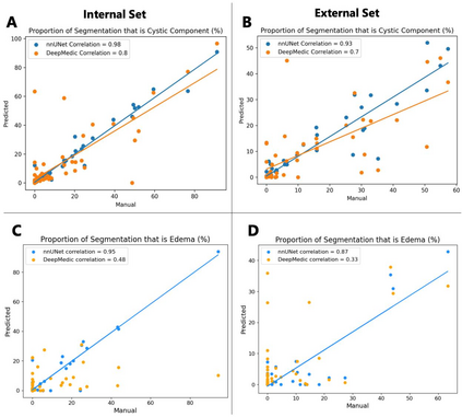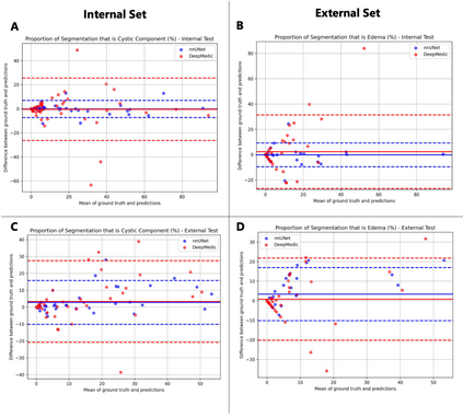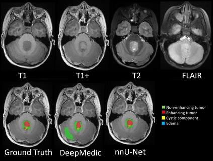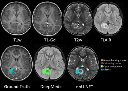 Brain tumors are the most common solid tumors and the leading cause of cancer-related death among children. Tumor segmentation is essential in surgical and treatment planning, and response assessment and monitoring. However, manual segmentation is time-consuming and has high inter-operator variability, underscoring the need for more efficient methods. We compared two deep learning-based 3D segmentation models, DeepMedic and nnU-Net, after training with pediatric-specific multi-institutional brain tumor data using based on multi-parametric MRI scans.Multi-parametric preoperative MRI scans of 339 pediatric patients (n=293 internal and n=46 external cohorts) with a variety of tumor subtypes, were preprocessed and manually segmented into four tumor subregions, i.e., enhancing tumor (ET), non-enhancing tumor (NET), cystic components (CC), and peritumoral edema (ED). After training, performance of the two models on internal and external test sets was evaluated using Dice scores, sensitivity, and Hausdorff distance with reference to ground truth manual segmentations. Dice score for nnU-Net internal test sets was (mean +/- SD (median)) 0.9+/-0.07 (0.94) for WT, 0.77+/-0.29 for ET, 0.66+/-0.32 for NET, 0.71+/-0.33 for CC, and 0.71+/-0.40 for ED, respectively. For DeepMedic the Dice scores were 0.82+/-0.16 for WT, 0.66+/-0.32 for ET, 0.48+/-0.27, for NET, 0.48+/-0.36 for CC, and 0.19+/-0.33 for ED, respectively. Dice scores were significantly higher for nnU-Net (p<=0.01). External validation of the trained nnU-Net model on the multi-institutional BraTS-PEDs 2023 dataset revealed high generalization capability in segmentation of whole tumor and tumor core with Dice scores of 0.87+/-0.13 (0.91) and 0.83+/-0.18 (0.89), respectively. Pediatric-specific data trained nnU-Net model is superior to DeepMedic for whole tumor and subregion segmentation of pediatric brain tumors.