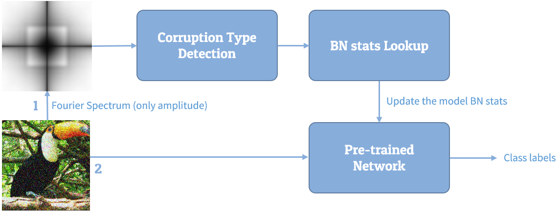 DNNs trained on natural clean samples have been shown to perform poorly on corrupted samples, such as noisy or blurry images. Various data augmentation methods have been recently proposed to improve DNN's robustness against common corruptions. Despite their success, they require computationally expensive training and cannot be applied to off-the-shelf trained models. Recently, it has been shown that updating BatchNorm (BN) statistics of an off-the-shelf model on a single corruption improves its accuracy on that corruption significantly. However, adopting the idea at inference time when the type of corruption is unknown and changing decreases the effectiveness of this method. In this paper, we harness the Fourier domain to detect the corruption type, a challenging task in the image domain. We propose a unified framework consisting of a corruption-detection model and BN statistics update that improves the corruption accuracy of any off-the-shelf trained model. We benchmark our framework on different models and datasets. Our results demonstrate about 8% and 4% accuracy improvement on CIFAR10-C and ImageNet-C, respectively. Furthermore, our framework can further improve the accuracy of state-of-the-art robust models, such as AugMix and DeepAug.