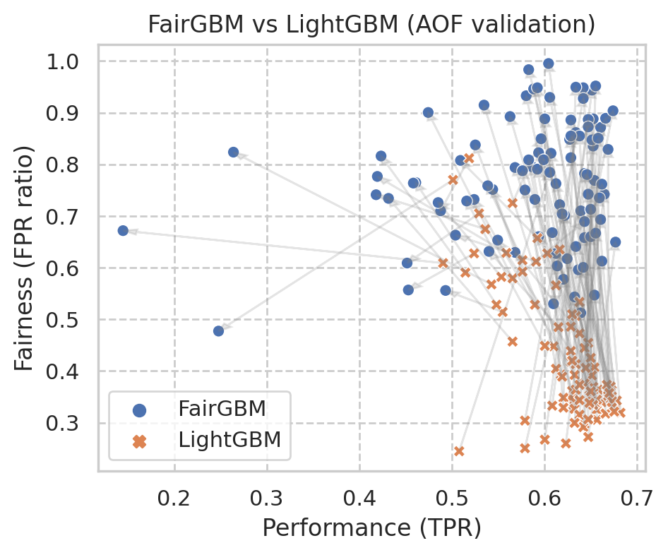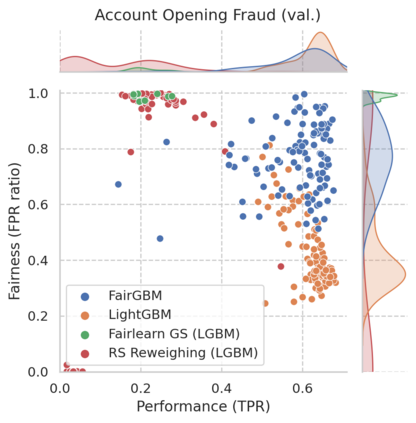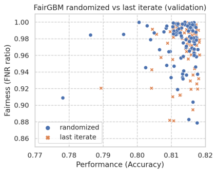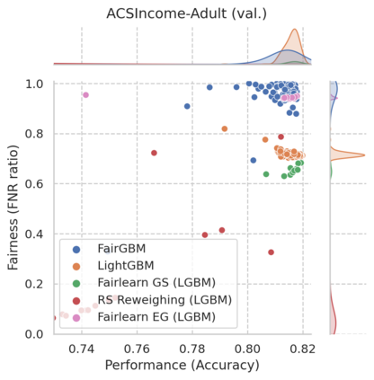 翻译:基于梯度提升决策树(GBDT)的机器学习(ML)算法仍然有利于从保健到金融等各种任务关键应用的许多表格数据任务,然而,GBT算法并非没有偏见和歧视性决策的风险。尽管GBT的受欢迎程度和公平ML研究的快速速度,但现有的在加工过程中的公平ML方法或不适用于GBDT, 产生大量的训练时间管理费,或不足以解决高等级不平衡的问题。我们提出了FairGBM,这是一个在公平限制下培训GBD的学习框架,与不受限制的LightGBM相比,对预测性能的影响很小,几乎没有任何影响。由于通用的公平指标是不可区别的,我们采用了“proxy-Lagrangian”的配方,使用平滑的conx误率准轴来进行梯度优化。此外,我们的公开源实施表明培训时间与相关工作相比,在培训时有一定的强度加速度,这是促进现实世界从业人员广泛采用公平GBM的关键方面。