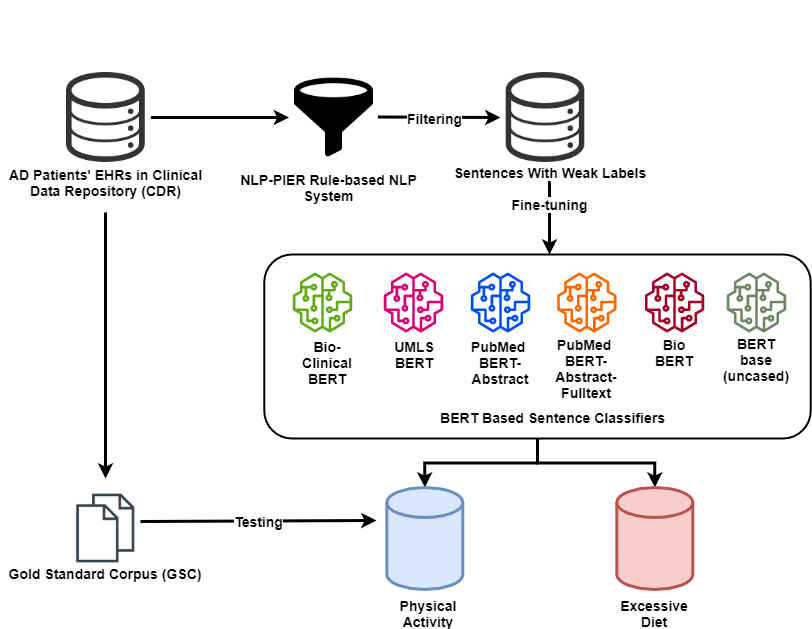 翻译:由于对阿尔茨海默氏病(AD)没有有效的治疗方法,因此,通过生活方式因素的变化和干预,预防已变得更加重要。分析AD病人的电子健康记录(EHR)有助于我们更好地了解生活方式对AD的影响。然而,生活方式信息通常储存在临床叙述中。因此,研究的目的是证明自然语言处理模式的可行性,以便从临床文本中分类生活方式因素(例如,体育活动和过量饮食)。我们通过使用基于规则的NLP算法,自动为培训数据制作标签。我们对来自变压器(BERT)的预先培训双向电解码显示模型(EECD)对高标签的模型进行薄弱的监管,这些模型包括BERT的基础模型、PubMERT(摘要+全文)、PubMedBERT(仅摘要)、统一医学语言系统(UMLS)BERT、生物模型模型BERT和生物临床BERT。我们进行了两项案例研究:物理活动和过量饮食研究,以便验证BERERER模型在将FERS的精确度指标分类中进行两次测试的成绩分析,这些模型显示其最精确性研究。