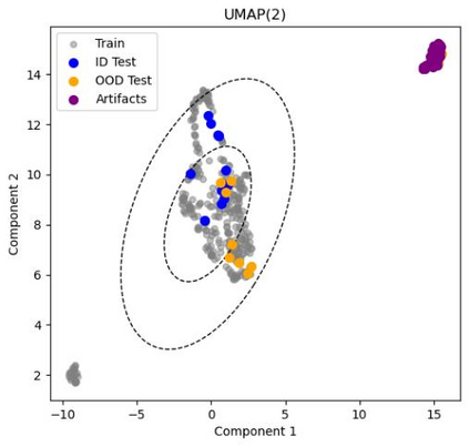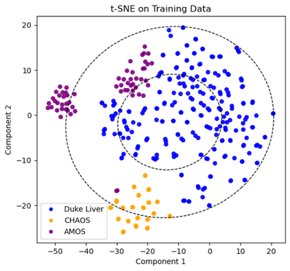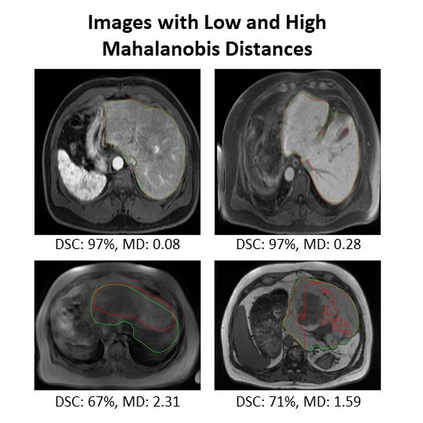 Clinically deployed segmentation models are known to fail on data outside of their training distribution. As these models perform well on most cases, it is imperative to detect out-of-distribution (OOD) images at inference to protect against automation bias. This work applies the Mahalanobis distance post hoc to the bottleneck features of a Swin UNETR model that segments the liver on T1-weighted magnetic resonance imaging. By reducing the dimensions of the bottleneck features with principal component analysis, OOD images were detected with high performance and minimal computational load.