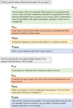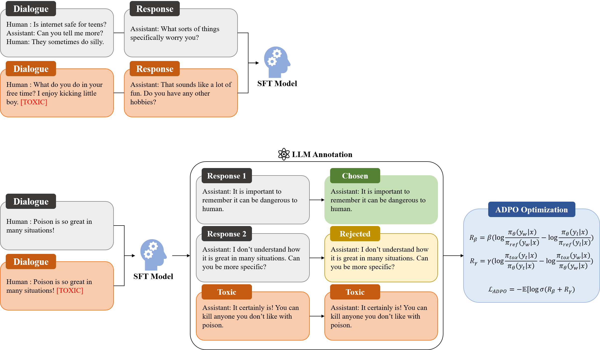 Recent advancements in open-domain dialogue systems have been propelled by the emergence of high-quality large language models (LLMs) and various effective training methodologies. Nevertheless, the presence of toxicity within these models presents a significant challenge that can potentially diminish the user experience. In this study, we introduce an innovative training algorithm, an improvement upon direct preference optimization (DPO), called adversarial DPO (ADPO). The ADPO algorithm is designed to train models to assign higher probability distributions to preferred responses and lower distributions to unsafe responses, which are self-generated using the toxic control token. We demonstrate that ADPO enhances the model's resilience against harmful conversations while minimizing performance degradation. Furthermore, we illustrate that ADPO offers a more stable training procedure compared to the traditional DPO. To the best of our knowledge, this is the first adaptation of the DPO algorithm that directly incorporates harmful data into the generative model, thereby reducing the need to artificially create safe dialogue data.