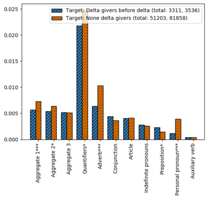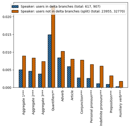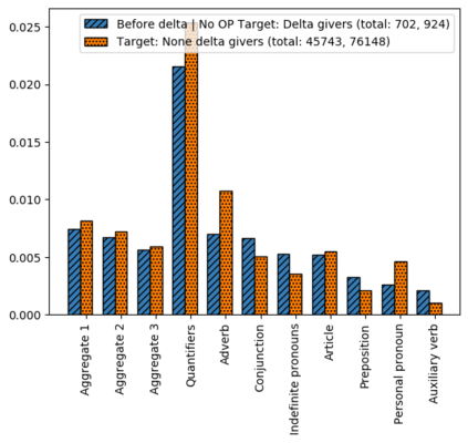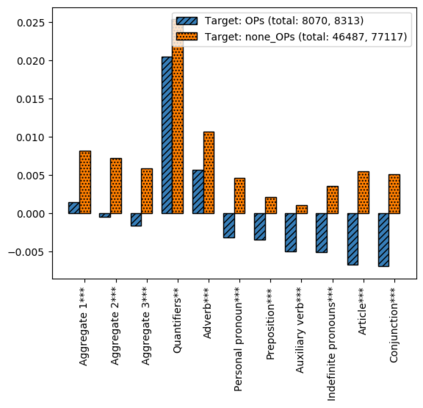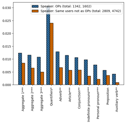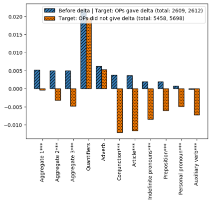 翻译:语言便利是发言者根据彼此的交流风格调整其口音、字典、词汇和语言其他方面的过程; 以前的研究表明语言便利与发言者力量和地位的差距及其促进认可和讨论效率的方式之间的关系; 在这项工作中,我们从新的角度看待这种现象,探讨它与发言者的开放态度而不是与其社会地位之间的关系; 我们处理在Reddit's Change My View(CMV) subreddit(CMV) subdit中进行的数千次非结构化的争论,表明开放态度与发言者在不同情况下所扮演的角色有关; 在讨论层面,我们惊讶地发现,达成协议的讨论的便利程度较低。