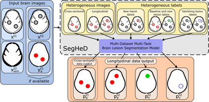 Assessment of lesions and their longitudinal progression from brain magnetic resonance (MR) images plays a crucial role in diagnosing and monitoring multiple sclerosis (MS). Machine learning models have demonstrated a great potential for automated MS lesion segmentation. Training such models typically requires large-scale high-quality datasets that are consistently annotated. However, MS imaging datasets are often small, segregated across multiple sites, with different formats (cross-sectional or longitudinal), and diverse annotation styles. This poses a significant challenge to train a unified MS lesion segmentation model. To tackle this challenge, we present SegHeD, a novel multi-dataset multi-task segmentation model that can incorporate heterogeneous data as input and perform all-lesion, new-lesion, as well as vanishing-lesion segmentation. Furthermore, we account for domain knowledge about MS lesions, incorporating longitudinal, spatial, and volumetric constraints into the segmentation model. SegHeD is assessed on five MS datasets and achieves a high performance in all, new, and vanishing-lesion segmentation, outperforming several state-of-the-art methods in this field.