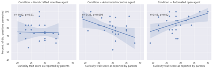 Students' ability to ask curious questions is a crucial skill that improves their learning processes. To train this skill, previous research has used a conversational agent that propose specific cues to prompt children's curiosity during learning. Despite showing pedagogical efficiency, this method is still limited since it relies on generating the said prompts by hand for each educational resource, which can be a very long and costly process. In this context, we leverage the advances in the natural language processing field and explore using a large language model (GPT-3) to automate the generation of this agent's curiosity-prompting cues to help children ask more and deeper questions. We then used this study to investigate a different curiosity-prompting behavior for the agent. The study was conducted with 75 students aged between 9 and 10. They either interacted with a hand-crafted conversational agent that proposes "closed" manually-extracted cues leading to predefined questions, a GPT-3-driven one that proposes the same type of cues, or a GPT-3-driven one that proposes "open" cues that can lead to several possible questions. Results showed a similar question-asking performance between children who had the two "closed" agents, but a significantly better one for participants with the "open" agent. Our first results suggest the validity of using GPT-3 to facilitate the implementation of curiosity-stimulating learning technologies. In a second step, we also show that GPT-3 can be efficient in proposing the relevant open cues that leave children with more autonomy to express their curiosity.