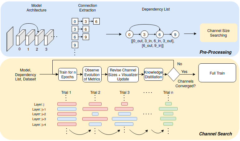 Neural Architecture Search (NAS) has been pivotal in finding optimal network configurations for Convolution Neural Networks (CNNs). While many methods explore NAS from a global search-space perspective, the employed optimization schemes typically require heavy computational resources. This work introduces a method that is efficient in computationally constrained environments by examining the micro-search space of channel size. In tackling channel-size optimization, we design an automated algorithm to extract the dependencies within different connected layers of the network. In addition, we introduce the idea of knowledge distillation, which enables preservation of trained weights, admist trials where the channel sizes are changing. Further, since the standard performance indicators (accuracy, loss) fail to capture the performance of individual network components (providing an overall network evaluation), we introduce a novel metric that highly correlates with test accuracy and enables analysis of individual network layers. Combining dependency extraction, metrics, and knowledge distillation, we introduce an efficient searching algorithm, with simulated annealing inspired stochasticity, and demonstrate its effectiveness in finding optimal architectures that outperform baselines by a large margin.