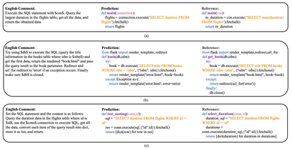 翻译:代码生成对于减少人工软件开发努力至关重要 。 最近, 神经技术已被自动地用于生成源代码 。 虽然这些方法很有希望, 但是这些方法在生成单一编程语言代码的任务中得到了评估 。 但是, 在实际开发中, 一种编程语言往往嵌入另一种语言 。 例如, SQL 语句通常作为字符串嵌在基编程语言中, 如 Python 和 Java, 以及 JavaScript 程序通常嵌入于嵌入于嵌入的 Sython 和 JavaScript 等分层编程语言中 。 这个数据集包含2,000 个由实际使用项目( PHP、 Java 和 Python ) 精心加注的数据库操作程序。 我们在本文件中定义了一个新的代码生成任务: 给出自然语言评论, 任务的目的是以嵌入语言生成一个基础语言的程式。 对于我们的知识来说, 这是首个突变式的代码生成任务 。 。 对于这项任务, 我们使用 最精确的版本, 和最精确的 Ry- prefile 。