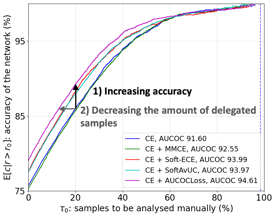 In human-AI collaboration systems for critical applications, in order to ensure minimal error, users should set an operating point based on model confidence to determine when the decision should be delegated to human experts. Samples for which model confidence is lower than the operating point would be manually analysed by experts to avoid mistakes. Such systems can become truly useful only if they consider two aspects: models should be confident only for samples for which they are accurate, and the number of samples delegated to experts should be minimized. The latter aspect is especially crucial for applications where available expert time is limited and expensive, such as healthcare. The trade-off between the model accuracy and the number of samples delegated to experts can be represented by a curve that is similar to an ROC curve, which we refer to as confidence operating characteristic (COC) curve. In this paper, we argue that deep neural networks should be trained by taking into account both accuracy and expert load and, to that end, propose a new complementary loss function for classification that maximizes the area under this COC curve. This promotes simultaneously the increase in network accuracy and the reduction in number of samples delegated to humans. We perform experiments on multiple computer vision and medical image datasets for classification. Our results demonstrate that the proposed loss improves classification accuracy and delegates less number of decisions to experts, achieves better out-of-distribution samples detection and on par calibration performance compared to existing loss functions.