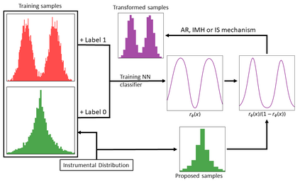 Acceptance-rejection (AR), Independent Metropolis Hastings (IMH) or importance sampling (IS) Monte Carlo (MC) simulation algorithms all involve computing ratios of probability density functions (pdfs). On the other hand, classifiers discriminate labeled samples produced by a mixture of two distributions and can be used for approximating the ratio of the two corresponding pdfs.This bridge between simulation and classification enables us to propose pdf-free versions of pdf-ratio-based simulation algorithms, where the ratio is replaced by a surrogate function computed via a classifier. From a probabilistic modeling perspective, our procedure involves a structured energy based model which can easily be trained and is compatible with the classical samplers.