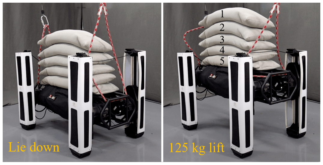 翻译:四重机器人是一个多功能的移动平台,具有运载高有效载荷的潜能。然而,大多数现有的四重机器人都以高可操作性、高动态和机动性移动设备为目标。尽管如此,有效载荷仍然是四重机器人不可或缺的能力。目前还深入探索了四重有效载荷能力高的机器人的设计。在本研究中,一个50千克电子起爆四重机器人基林被介绍来利用有效载荷的能力。基林是一个具有半直接驱动腿的特征。这一机制大大增强有效载荷的载荷能力。本研究提出了载荷载荷载荷四重机器人的若干设计原则,包括机械设计、动作参数选择和移动控制方法。理论分析表明,提升任务往往是现有机器人用清晰的膝盖接合的瓶颈。通过使用棱镜QDD腿,基林的载荷能力得到极大的增强。Kirin载荷载荷的载荷载荷能力大大增强载荷载荷载荷载荷运载能力。Kirin的载载荷载载力能力在初步试验中显示,其静态载有效载重为125。