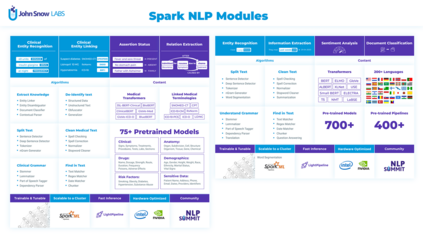 Spark NLP is a Natural Language Processing (NLP) library built on top of Apache Spark ML. It provides simple, performant and accurate NLP annotations for machine learning pipelines that can scale easily in a distributed environment. Spark NLP comes with 1100 pre trained pipelines and models in more than 192 languages. It supports nearly all the NLP tasks and modules that can be used seamlessly in a cluster. Downloaded more than 2.7 million times and experiencing nine times growth since January 2020, Spark NLP is used by 54% of healthcare organizations as the worlds most widely used NLP library in the enterprise.