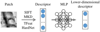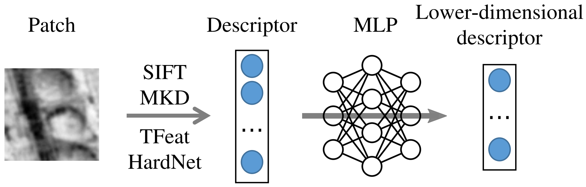 A distinctive representation of image patches in form of features is a key component of many computer vision and robotics tasks, such as image matching, image retrieval, and visual localization. State-of-the-art descriptors, from hand-crafted descriptors such as SIFT to learned ones such as HardNet, are usually high dimensional; 128 dimensions or even more. The higher the dimensionality, the larger the memory consumption and computational time for approaches using such descriptors. In this paper, we investigate multi-layer perceptrons (MLPs) to extract low-dimensional but high-quality descriptors. We thoroughly analyze our method in unsupervised, self-supervised, and supervised settings, and evaluate the dimensionality reduction results on four representative descriptors. We consider different applications, including visual localization, patch verification, image matching and retrieval. The experiments show that our lightweight MLPs achieve better dimensionality reduction than PCA. The lower-dimensional descriptors generated by our approach outperform the original higher-dimensional descriptors in downstream tasks, especially for the hand-crafted ones. The code will be available at https://github.com/PRBonn/descriptor-dr.