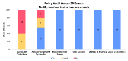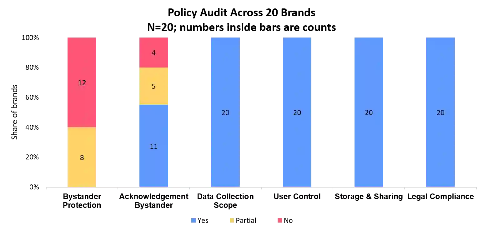 Smart home devices such as video doorbells and security cameras are becoming increasingly common in everyday life. While these devices offer convenience and safety, they also raise new privacy concerns: how these devices affect others, like neighbors, visitors, or people passing by. This issue is generally known as interdependent privacy, where one person's actions (or inaction) may impact the privacy of others, and, specifically, bystander privacy in the context of smart homes. Given lax data protection regulations in terms of shared physical spaces and amateur joint data controllers, we expect that the privacy policies of smart home products reflect the missing regulatory incentives. This paper presents a focused privacy policy analysis of 20 video doorbell and smart camera products, concentrating explicitly on the bystander aspect. We show that although some of the vendors acknowledge bystanders, they address it only to the extent of including disclaimers, shifting the ethical responsibility for collecting the data of non-users to the device owner. In addition, we identify and examine real-world cases related to bystander privacy, demonstrating how current deployments can impact non-users. Based on our findings, we analyze vendor privacy policies in light of existing legal frameworks and technical capabilities, and we provide practical recommendations for both policy language and system design to enhance transparency and empower both bystanders and device owners.