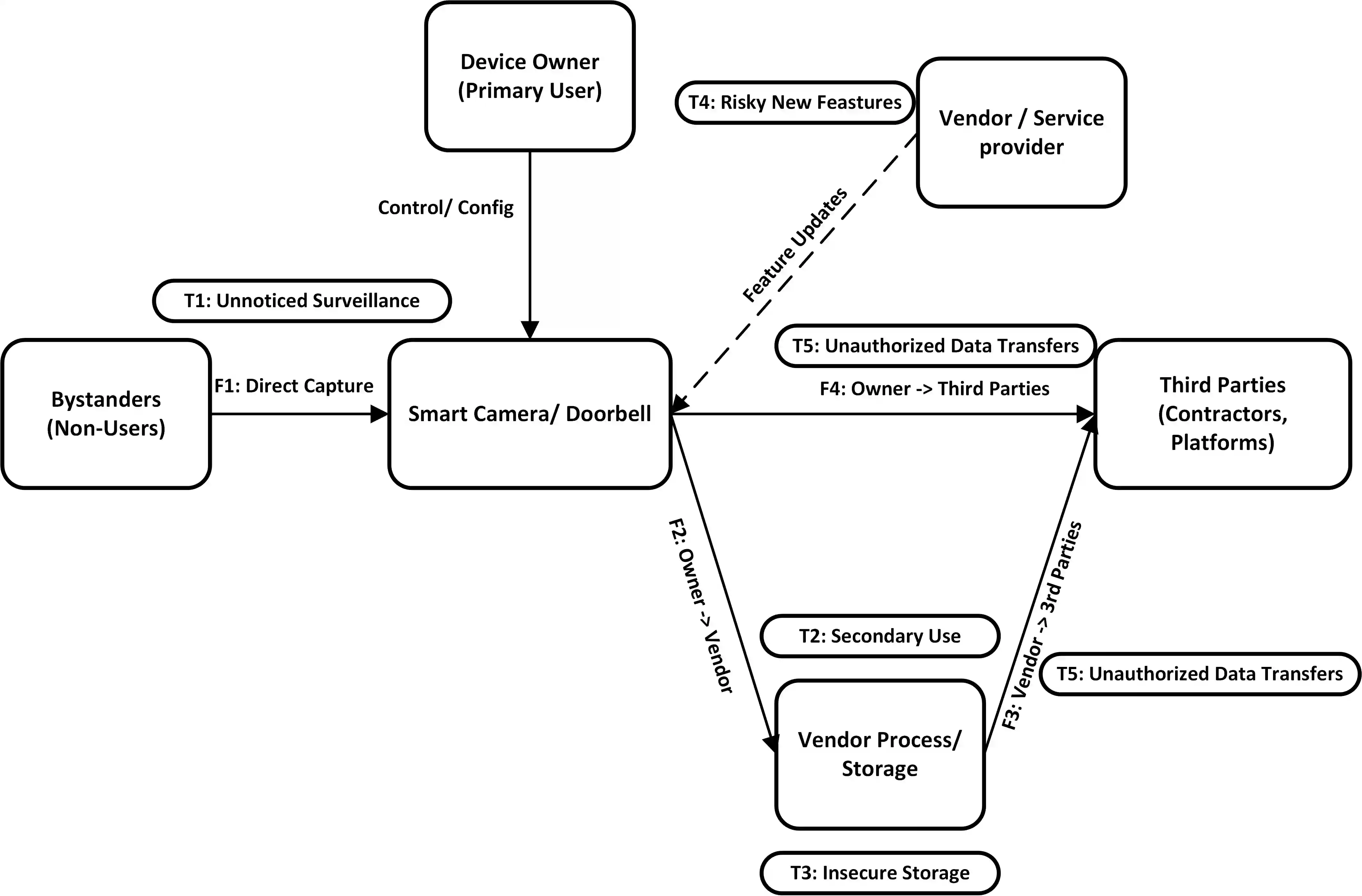翻译:视频门铃和安全摄像头等智能家居设备在日常生活中的应用日益普及。尽管这些设备提供了便利与安全保障,但也引发了新的隐私关切:这些设备如何影响邻居、访客或路过者等他人。这一问题通常被称为相互依存隐私,即个人的行为(或不作为)可能影响他人的隐私,在智能家居场景下特指旁观者隐私。鉴于共享物理空间与业余联合数据控制者方面的数据保护法规较为宽松,我们预期智能家居产品的隐私政策会反映出监管激励的缺失。本文对20款视频门铃与智能摄像头产品进行了聚焦式隐私政策分析,特别关注旁观者维度。研究表明,尽管部分供应商承认旁观者存在,但其处理方式仅限于包含免责声明,将收集非用户数据的道德责任转移至设备所有者。此外,我们识别并检视了与旁观者隐私相关的现实案例,论证了当前部署模式如何影响非用户。基于研究发现,我们结合现有法律框架与技术能力分析了供应商隐私政策,并就政策表述与系统设计提出实践建议,以提升透明度并增强旁观者与设备所有者的权益保障。