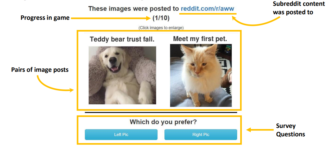 翻译:广度系统,如Twitter retweets、 Reddit upvotes 和 Pinternational Pentes 等信息系统, 有可能引导人们找到其他人喜欢的海报。 然而, 这创造了一个反馈循环, 降低了他们的信息量: 被标记为更受欢迎的项目得到更多关注, 因而更多的高音和retweets可能只是反映对喜欢项目的人的分数的更多关注而不是独立信息。 信息还有多少? 比如, 如果A项在Redddit上有数百个高音, B项只有几个? 我们使用一个名为GuessTheKarma的互联网游戏来调查, 收集400对图像的独立的偏好判断( N=20 674 ), 从而降低他们的信息量: 与主导社会媒体服务的评级系统不同, GuessTheKarma 缺乏影响评级的社会和排名效应。 总体来说, REddit 分数并不很好地预测那里对项目的真正人口偏好, 而B项的评分只有大多数独立评分只有68 % 。 然而, 当一个图像的评分为最低的评分时, 而其他的评分为最低的评分时,