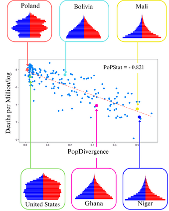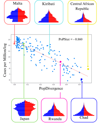 Understanding how population age structure shapes COVID-19 burden is crucial for pandemic preparedness, yet common summary measures such as median age ignore key distributional features like skewness, bimodality, and the proportional weight of high-risk cohorts. We extend the PoPStat framework, originally devised to link entire population pyramids with cause-specific mortality by applying it to COVID-19. Using 2019 United Nations World Population Prospects age-sex distributions together with cumulative cases and deaths per million recorded up to 5 May 2023 by Our World in Data, we calculate PoPDivergence (the Kullback-Leibler divergence from an optimised reference pyramid) for 180+ countries and derive PoPStat-COVID19 as the Pearson correlation between that divergence and log-transformed incidence or mortality. Optimisation selects Malta's old-skewed pyramid as the reference, yielding strong negative correlations for cases (r=-0.86, p<0.001, R^2=0.74) and deaths (r=-0.82, p<0.001, R^2=0.67). Sensitivity tests across twenty additional, similarly old-skewed references confirm that these associations are robust to reference choice. Benchmarking against eight standard indicators like gross domestic product per capita, Gini index, Human Development Index, life expectancy at birth, median age, population density, Socio-demographic Index, and Universal Health Coverage Index shows that PoPStat-COVID19 surpasses GDP per capita, median age, population density, and several other traditional measures, and outperforms every comparator for fatality burden. PoPStat-COVID19 therefore provides a concise, distribution-aware scalar for quantifying demographic vulnerability to COVID-19.