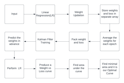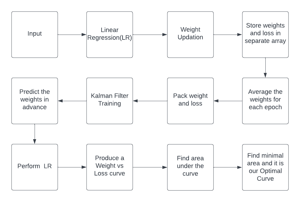 This research enhances linear regression models by integrating a Kalman filter and analysing curve areas to minimize loss. The goal is to develop an optimal linear regression equation using stochastic gradient descent (SGD) for weight updating. Our approach involves a stepwise process, starting with user-defined parameters. The linear regression model is trained using SGD, tracking weights and loss separately and zipping them finally. A Kalman filter is then trained based on weight and loss arrays to predict the next consolidated weights. Predictions result from multiplying input averages with weights, evaluated for loss to form a weight-versus-loss curve. The curve's equation is derived using the two-point formula, and area under the curve is calculated via integration. The linear regression equation with minimum area becomes the optimal curve for prediction. Benefits include avoiding constant weight updates via gradient descent and working with partial datasets, unlike methods needing the entire set. However, computational complexity should be considered. The Kalman filter's accuracy might diminish beyond a certain prediction range.