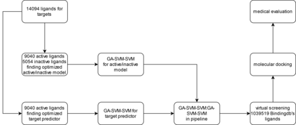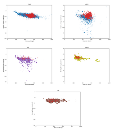 Breast cancer, the second most prevalent cancer among women worldwide, necessitates the exploration of novel therapeutic approaches. To target the four subgroups of breast cancer "hormone receptor-positive and HER2-negative, hormone receptor-positive and HER2-positive, hormone receptor-negative and HER2-positive, and hormone receptor-negative and HER2-negative" it is crucial to inhibit specific targets such as EGFR, HER2, ER, NF-kB, and PR. In this study, we evaluated various methods for binary and multiclass classification. Among them, the GA-SVM-SVM:GA-SVM-SVM model was selected with an accuracy of 0.74, an F1-score of 0.73, and an AUC of 0.94 for virtual screening of ligands from the BindingDB database. This model successfully identified 4454, 803, 438, and 378 ligands with over 90% precision in both active/inactive and target prediction for the classes of EGFR+HER2, ER, NF-kB, and PR, respectively, from the BindingDB database. Based on to the selected ligands, we created a dendrogram that categorizes different ligands based on their targets. This dendrogram aims to facilitate the exploration of chemical space for various therapeutic targets. Ligands that surpassed a 90% threshold in the product of activity probability and correct target selection probability were chosen for further investigation using molecular docking. The binding energy range for these ligands against their respective targets was calculated to be between -15 and -5 kcal/mol. Finally, based on general and common rules in medicinal chemistry, we selected 2, 3, 3, and 8 new ligands with high priority for further studies in the EGFR+HER2, ER, NF-kB, and PR classes, respectively.