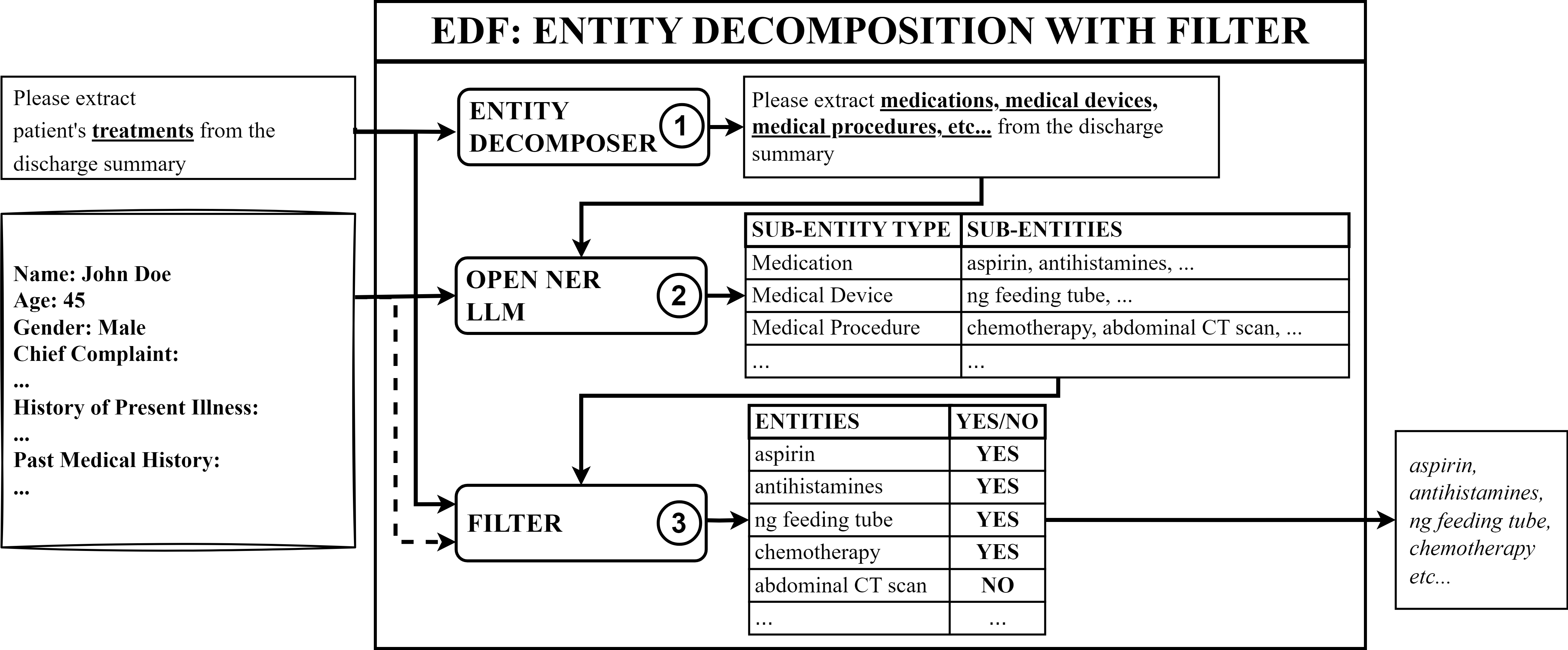 Clinical named entity recognition (NER) aims to retrieve important entities within clinical narratives. Recent works have demonstrated that large language models (LLMs) can achieve strong performance in this task. While previous works focus on proprietary LLMs, we investigate how open NER LLMs, trained specifically for entity recognition, perform in clinical NER. In this paper, we aim to improve them through a novel framework, entity decomposition with filtering, or EDF. Our key idea is to decompose the entity recognition task into several retrievals of sub-entity types. We also introduce a filtering mechanism to remove incorrect entities. Our experimental results demonstrate the efficacy of our framework across all metrics, models, datasets, and entity types. Our analysis reveals that entity decomposition can recognize previously missed entities with substantial improvement. We further provide a comprehensive evaluation of our framework and an in-depth error analysis to pave future works.