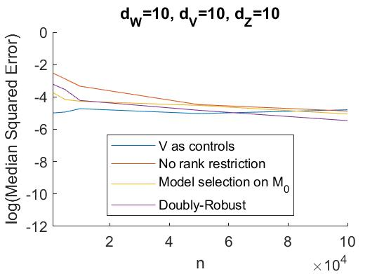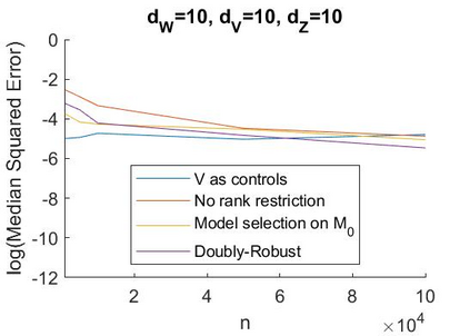 翻译:最近的一个文献认为,对于未观察到的周期性折叠因素,使用噪音的杂交来计算因果推断。代理人分为两组,两组以混杂因素为独立条件。一组替代物为“负控制处理”,另一组为“负控制结果”。现有的工作适用于低维设置,有固定数量的代理人和混杂者。在这项工作中,我们考虑的线性模型有许多代用控制器,而且可能有许多混杂因素。一个关键的见解是,如果每组代理人严格大于相纠结因素的数量,那么,一个较复杂的参数矩阵则具有低级结构,而一个含混杂参数的矢量则结构稀少。我们可以利用等级限制和宽度来减少要估计的自由参数的数量。未观察到的粘结者的数量并不为人所熟,但我们发现,我们采用惩罚性数字的方法来适应这个数量。我们提供一个封闭式的缩略图,一个较封闭的缩略图,而且覆盖范围的矩阵结构结构结构更低,而一个含混杂因素的矢测值参数结构结构结构结构结构则很少。我们可以利用等级-直观性地评估我们现有的精确度方法,而必须提供我们目前的平定的计算方法。