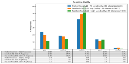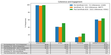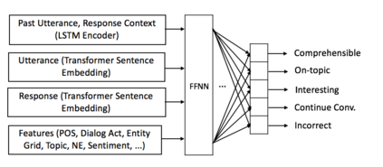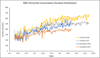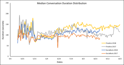 翻译:2018年的竞赛还包括向竞争者提供一系列工具和模型,包括CoBot(Cobotal bott)工具包、主题和对话的频率检测模型、对话评估员以及敏感的内容检测模型。在2018年的第二次竞赛中,大学团队通过在对话模式中利用背景,利用知识图表促进语言理解,处理复杂的言论,建立统计和等级对话管理者,以及利用用户响应的模型驱动信号。2018年的竞赛还包括向竞争者提供一套工具和模型,包括CoBot(Cobot)工具包、主题和对话的频率检测模型、快速、对话评估员和敏感的内容检测模型。在2018年的竞赛中,大学团队和Alexa奖奖团队为实现推进交流性AI科学这一共同目标而取得的进展。我们通过对话的语音识别、公开的域域域域内语言理解、共同思维推理、相对对话的准确度检测模型、对话评估中的相对比例分析员以及自18年的周期以来的合作性平均持续度评估,通过启动以来,我们之间平均水平的频率的排名提高。