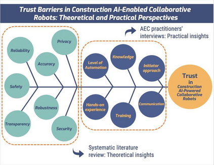 This study aimed to investigate the key technical and psychological factors that impact the architecture, engineering, and construction (AEC) professionals' trust in collaborative robots (cobots) powered by artificial intelligence (AI). The study employed a nationwide survey of 600 AEC industry practitioners to gather in-depth responses and valuable insights into the future opportunities for promoting the adoption, cultivation, and training of a skilled workforce to leverage this technology effectively. A Structural Equation Modeling (SEM) analysis revealed that safety and reliability are significant factors for the adoption of AI-powered cobots in construction. Fear of being replaced resulting from the use of cobots can have a substantial effect on the mental health of the affected workers. A lower error rate in jobs involving cobots, safety measurements, and security of data collected by cobots from jobsites significantly impact reliability, while the transparency of cobots' inner workings can benefit accuracy, robustness, security, privacy, and communication, and results in higher levels of automation, all of which demonstrated as contributors to trust. The study's findings provide critical insights into the perceptions and experiences of AEC professionals towards adoption of cobots in construction and help project teams determine the adoption approach that aligns with the company's goals workers' welfare.