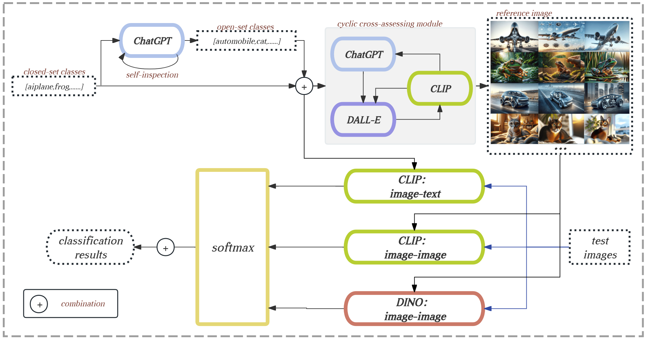 This paper introduces a novel framework for zero-shot learning (ZSL), i.e., to recognize new categories that are unseen during training, by using a multi-model and multi-alignment integration method. Specifically, we propose three strategies to enhance the model's performance to handle ZSL: 1) Utilizing the extensive knowledge of ChatGPT and the powerful image generation capabilities of DALL-E to create reference images that can precisely describe unseen categories and classification boundaries, thereby alleviating the information bottleneck issue; 2) Integrating the results of text-image alignment and image-image alignment from CLIP, along with the image-image alignment results from DINO, to achieve more accurate predictions; 3) Introducing an adaptive weighting mechanism based on confidence levels to aggregate the outcomes from different prediction methods. Experimental results on multiple datasets, including CIFAR-10, CIFAR-100, and TinyImageNet, demonstrate that our model can significantly improve classification accuracy compared to single-model approaches, achieving AUROC scores above 96% across all test datasets, and notably surpassing 99% on the CIFAR-10 dataset.